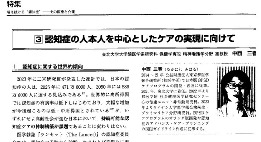 2025年3月10日 BPSD 月刊「保険診療」に日本版BPSDケアプログラムが掲載されました 「認知症の人本人を中心としたケアの実現に向けて」の中で、日本版BPSDケアプログラムが紹介されました。 東北大学大学院医学系研究科 保健学専攻 精神看護学分野 准教授中西三春先生 月刊保険診療2025.pdf